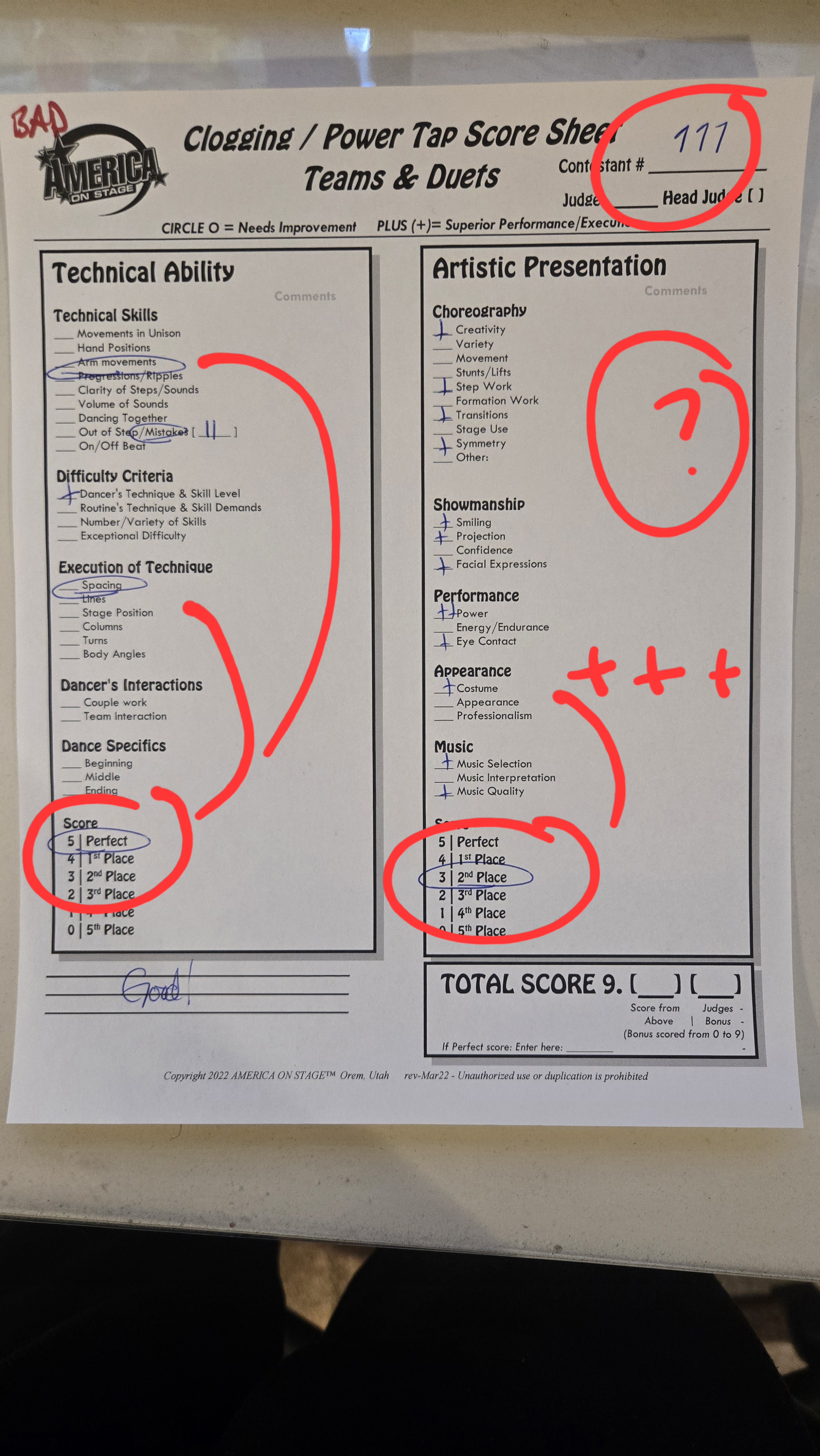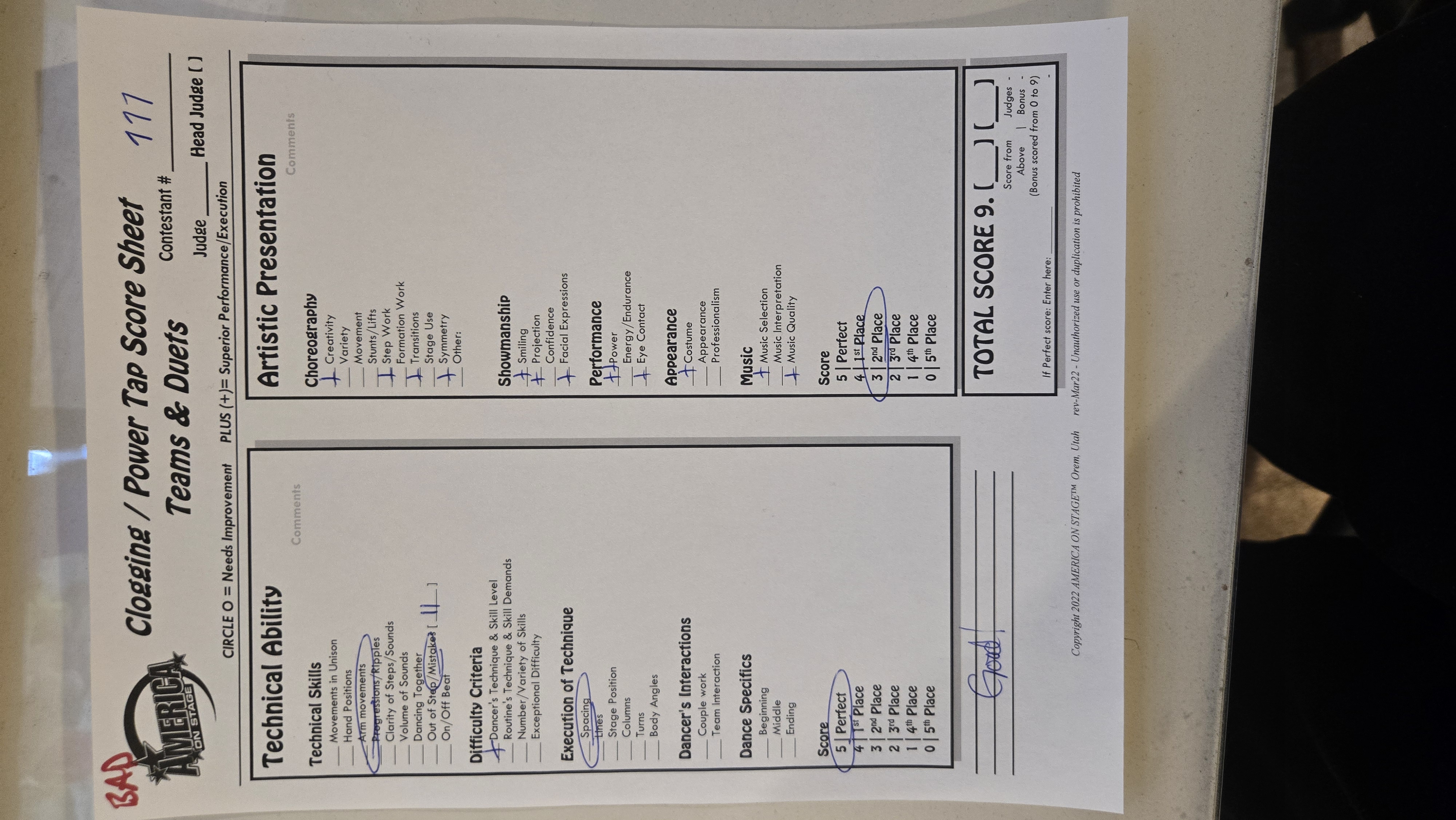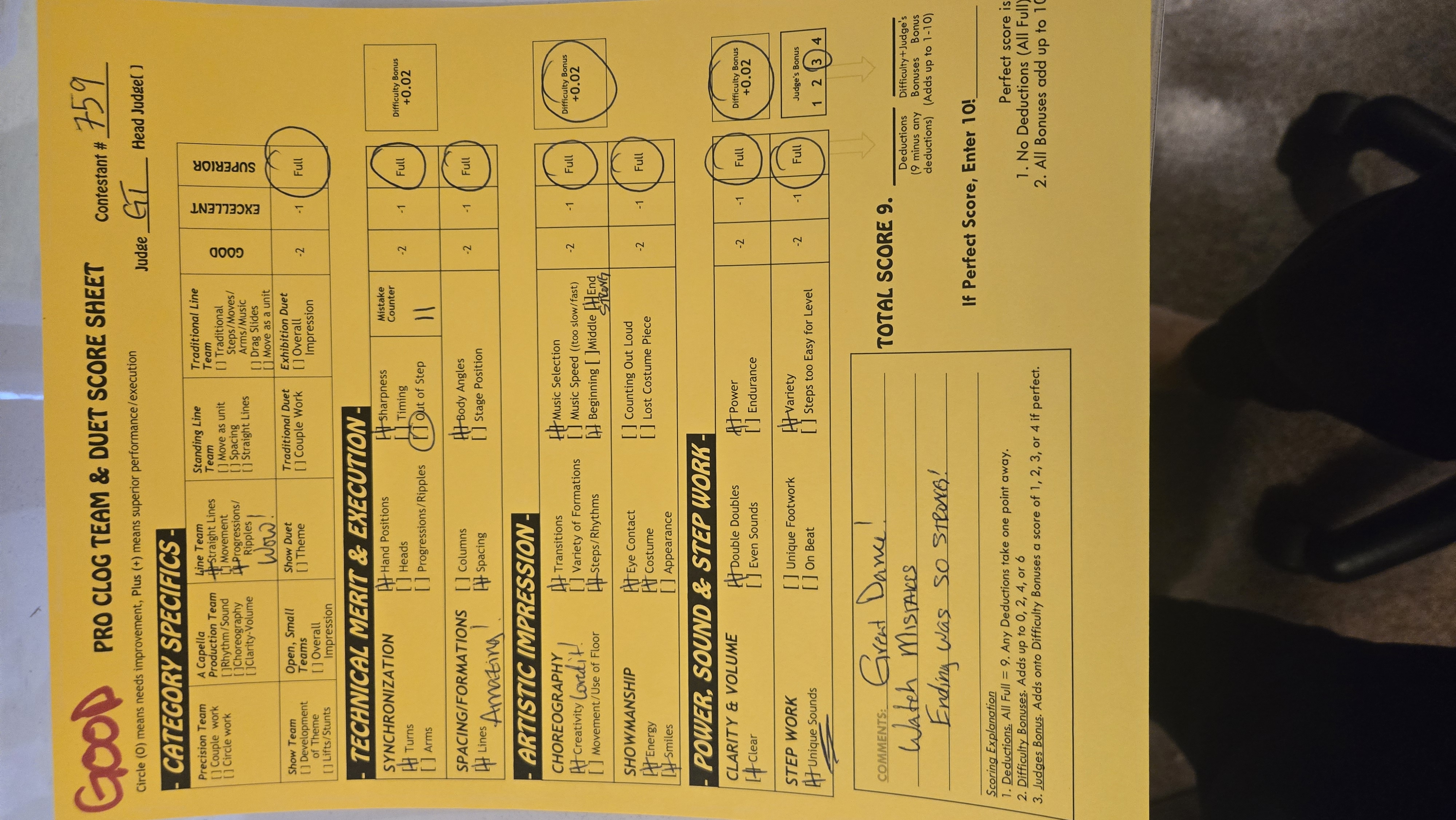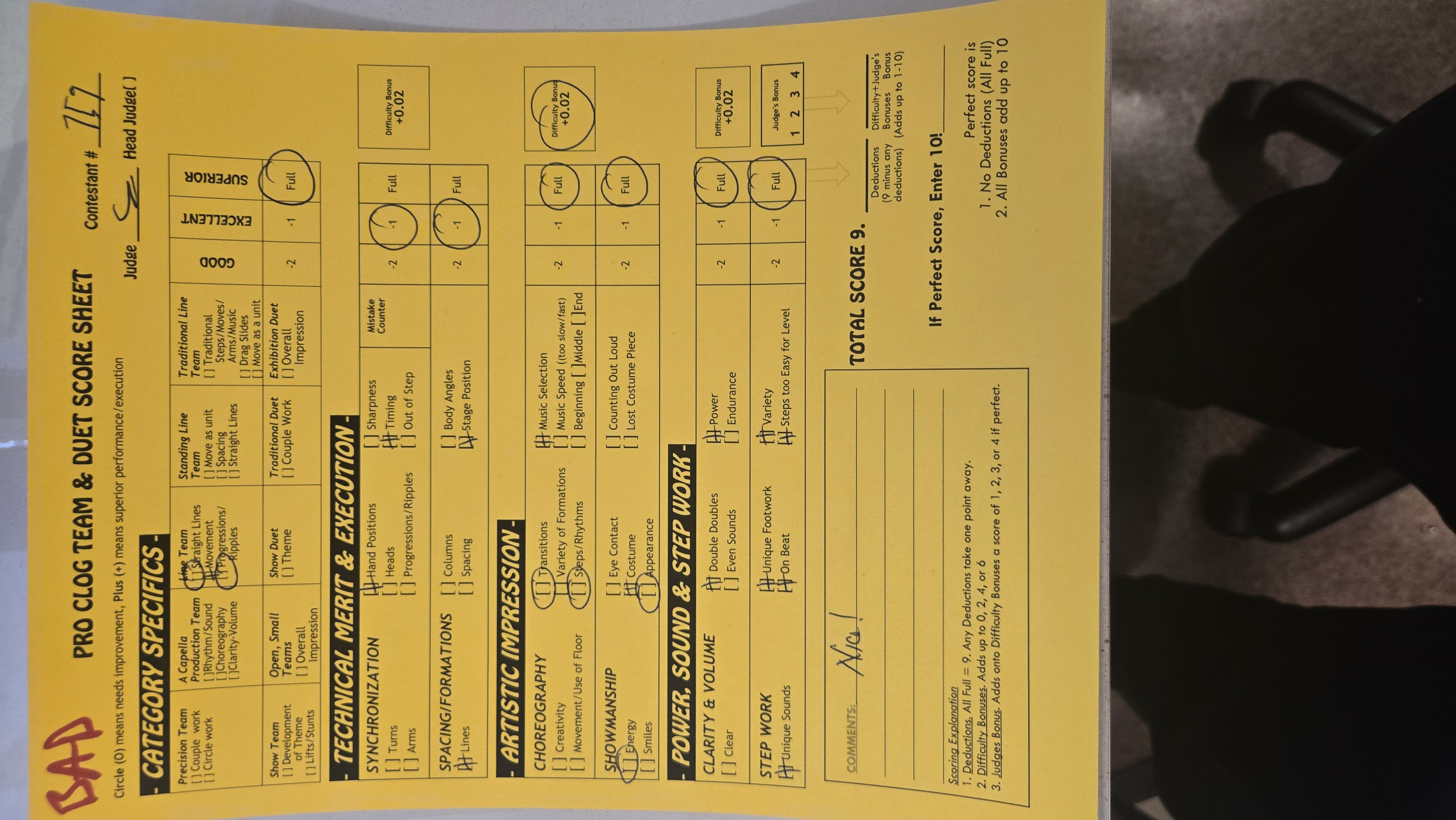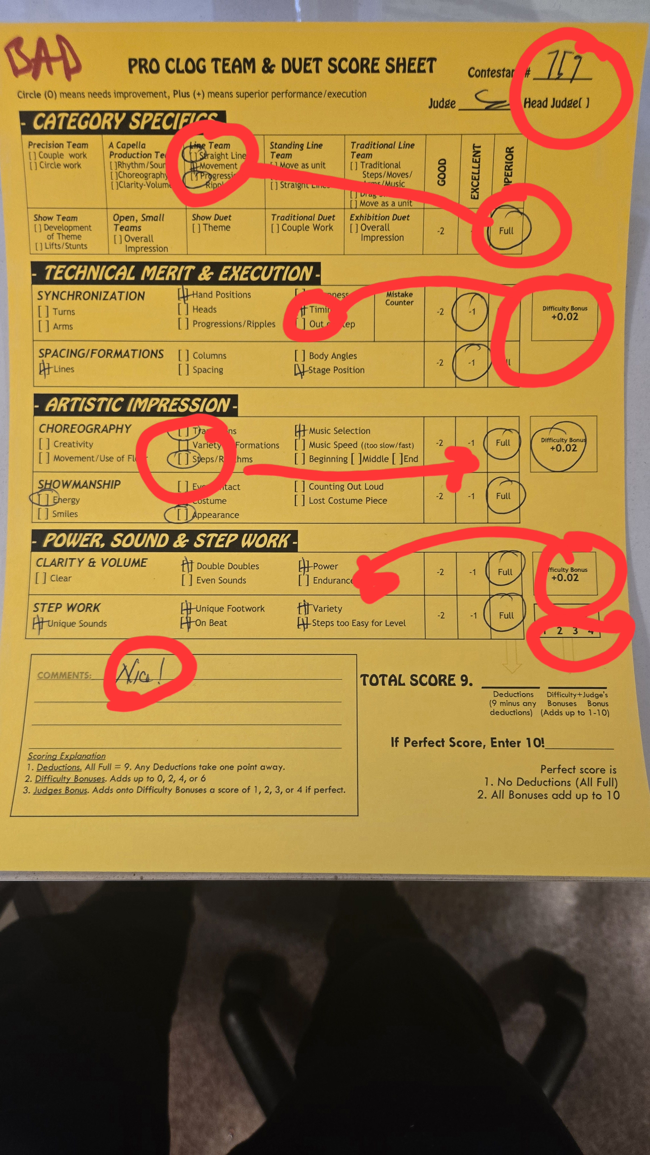 Score Sheets What makes a score sheet marked CORRECTLY? A perfect score is awarded with lots of pluses. Comments marked next to terms. If circles are marked, the score is not perfect, but is lower than perfect. Judges Bonus is awarded. Clog Score sheet marked CORRECTLY