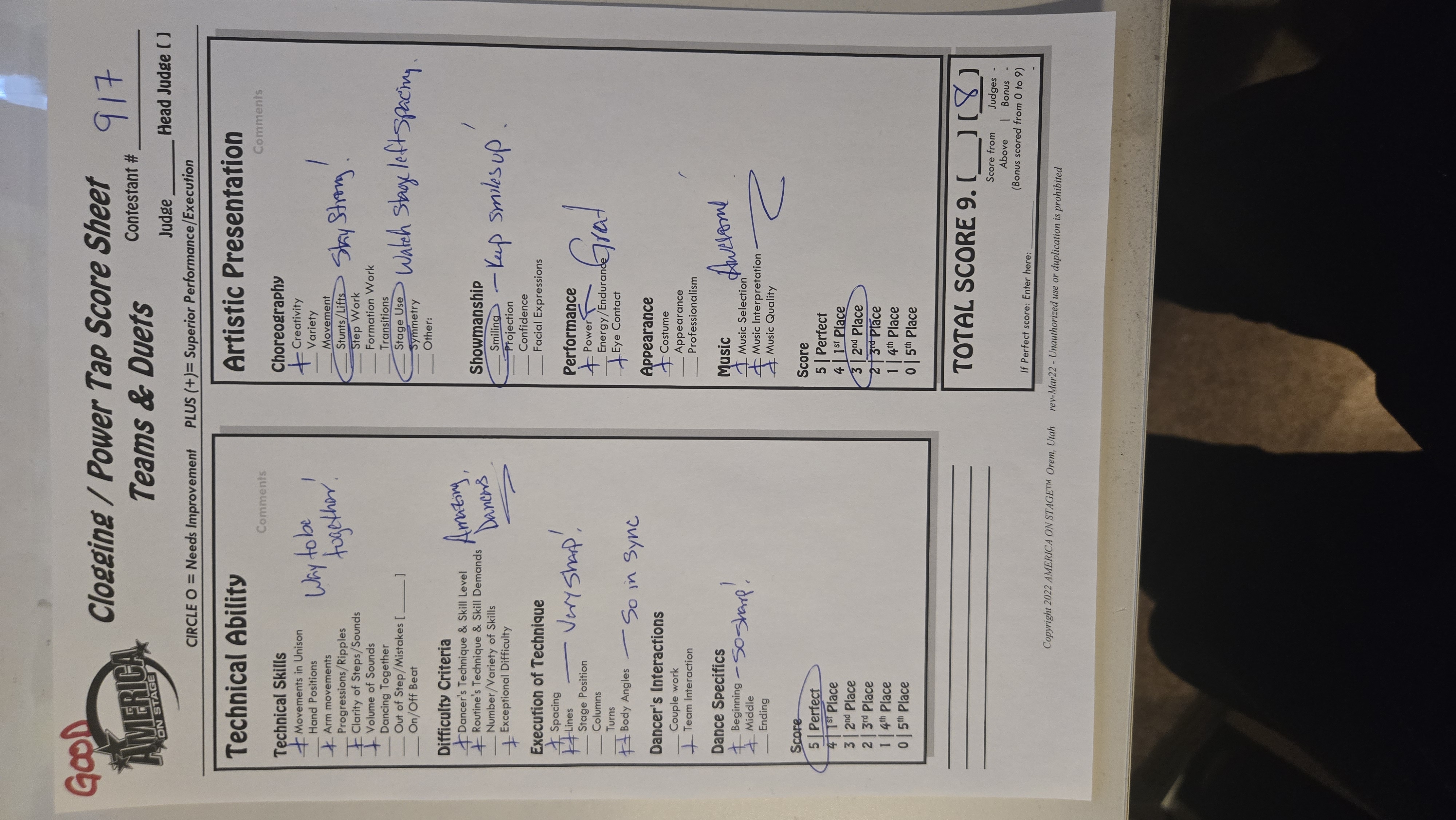 America On Stage CLOGGING/POWER TAP Judges Sheets Clogging Novice - Champ Teams & Long Duets